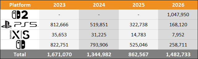 Note: VGChartz 2026, 2025, and 2023 estimates through March includes 13 weeks, while 2024 estimates includes 14 weeks.